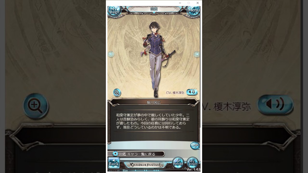 図鑑に登録される堀川国広の立ち絵とセリフ動画