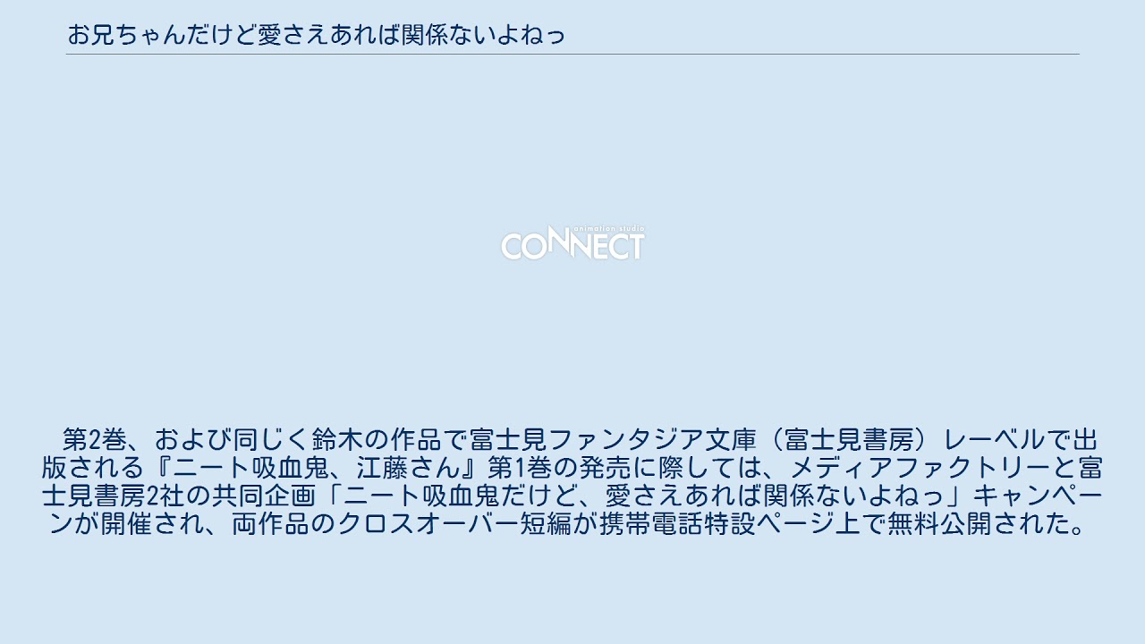 第2巻、および同じく鈴木の作品で富士見ファンタジア文庫(富士見書房)レーベルで出版される『ニート吸血鬼、江藤さん』第1巻の発売に際しては、メディアファクトリーと富士見書房2社の共同企画「ニート吸血鬼だけど、愛さえあれば関係ないよねっ」キャンペーンが開催され、両作品のクロスオーバー短編が携帯電話特設ページ上で無料公開された。