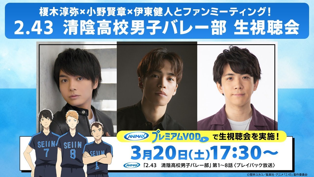 アニマックスで3/20(土)17:30から『2.43 清陰高校男子バレー部』1~8話を一挙に放送!そのアニメ放送と同日同時刻に作品キャストの榎木淳弥さん小野賢章さん伊東健人さんがアニマックスプレミアムVODに生出演し『2.43 清陰高校男子バレー部 生視聴会』を生配信します!アフレコ現場のマル秘エピソードトークはもちろん、生配信中に視聴者の皆様のお声に応えていただきます!