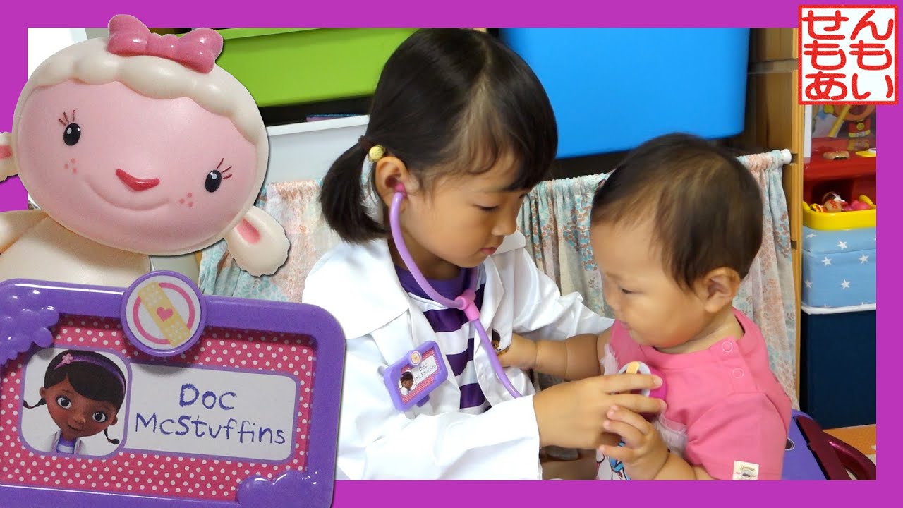 せんももの大好きな「ドックはおもちゃドクター」の診察セットであそびました!ドクターバッグや診察道具はアニメそっくりのデザイン。聴診器はちゃんと音がでるので雰囲気あります。ももこは髪の毛をおさげにし、白衣とカチューシャをつけて「ももドック」に変身しました(^^)