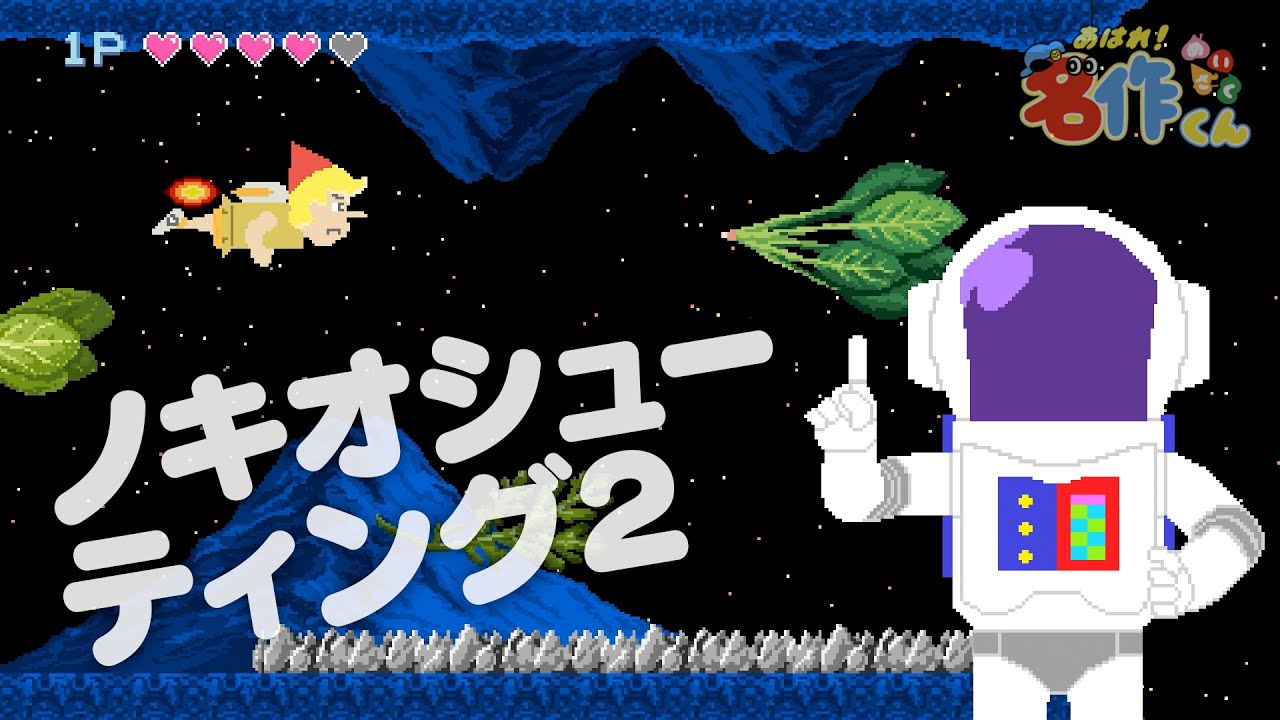 ゲーム「ノキオシューティング」の世界にやってきた名作くんたち。前回はやきとりと戦うゲームだったが、今度の敵は野菜。野菜をレーザーで撃ち落とせ!