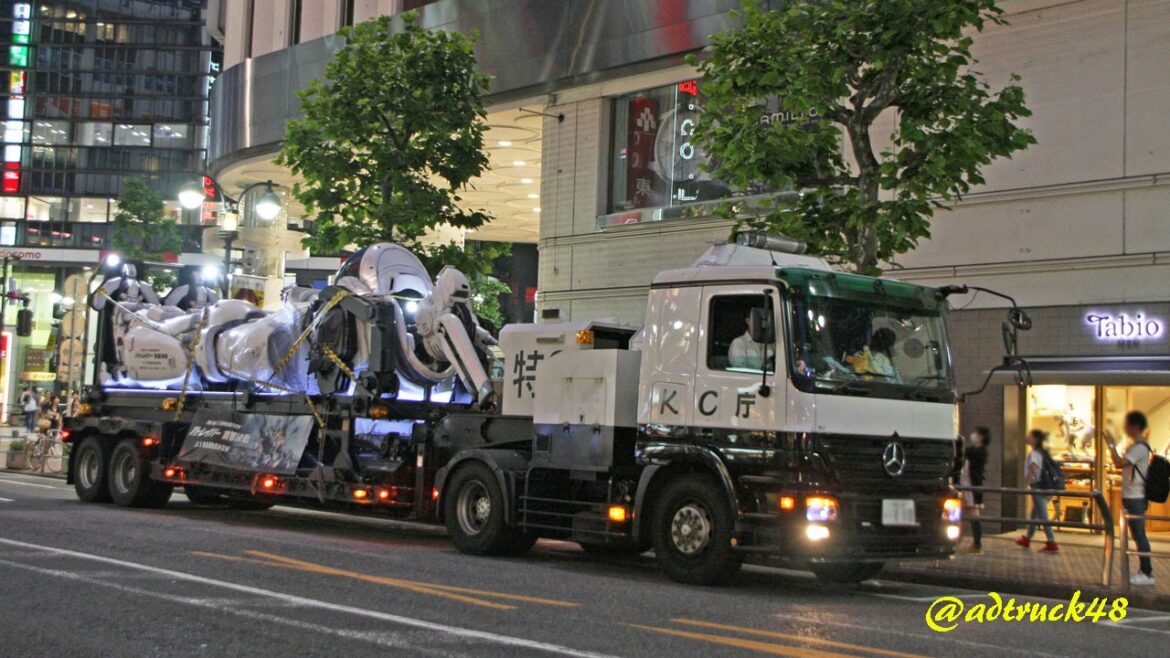 渋谷をパトロールする映画「TNG パトレイバー」のイングラムを乗っけたトラック