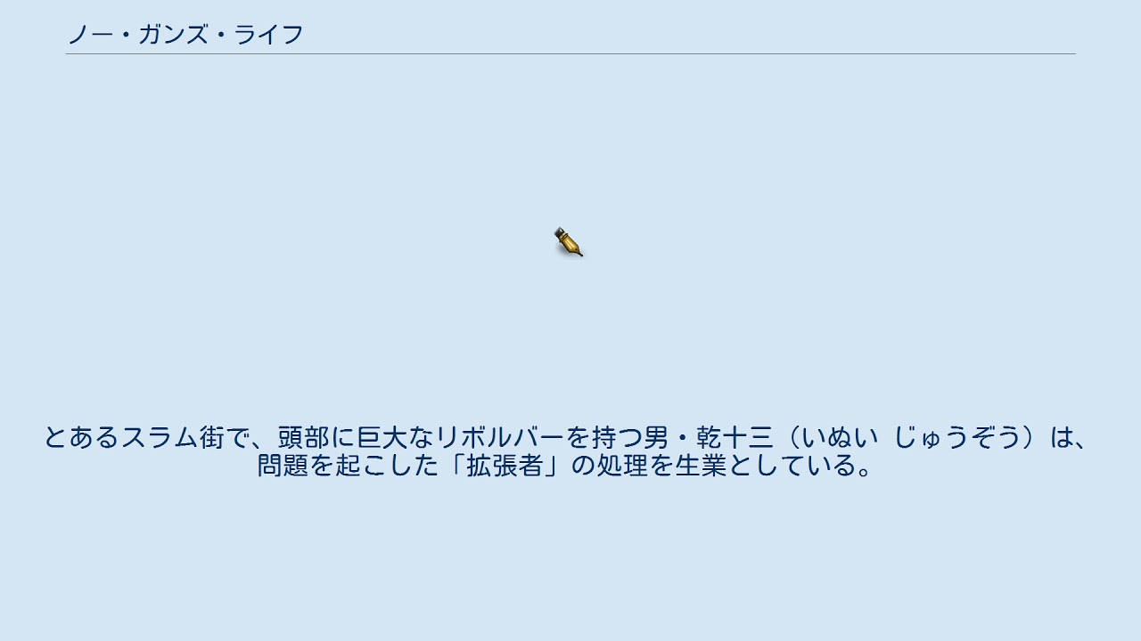 とあるスラム街で、頭部に巨大なリボルバーを持つ男・乾十三(いぬい じゅうぞう)は、問題を起こした「拡張者」の処理を生業としている。