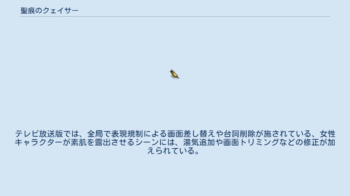 テレビ放送版では、全局で表現規制による画面差し替えや台詞削除が施されている、女性キャラクターが素肌を露出させるシーンには、湯気追加や画面トリミングなどの修正が加えられている。
