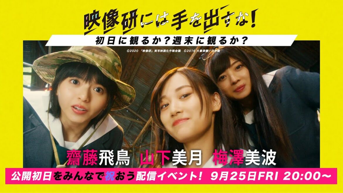 齋藤飛鳥、山下美月、梅澤美波らほか、豪華キャスト出演の 映画『映像研には手を出すな!』が9月25日(金)より、 いよいよ全国公開! この公開を記念して、 <実写『映像研には手を出すな!』 初日に観るか? 週末に観るか? 公開初日をみんなで祝う配信イベント> が、9月25日(金)21時頃〜ライブ配信が開催が決定! 当日は、齋藤飛鳥・山下美月・梅澤美波の電撃3人娘が生出演! 何を語るのか―――? 映画を観て挑むべきか? 配信を観てから映画館へ行くのか? どっちーーー??? ぜひ、お好みの順番でお楽しみください! 乃木坂46山下美月映像研映像研には手を出すな映像研には手を出すな!映画梅澤美波齋藤飛鳥 WACOCA: People, Life, Style.