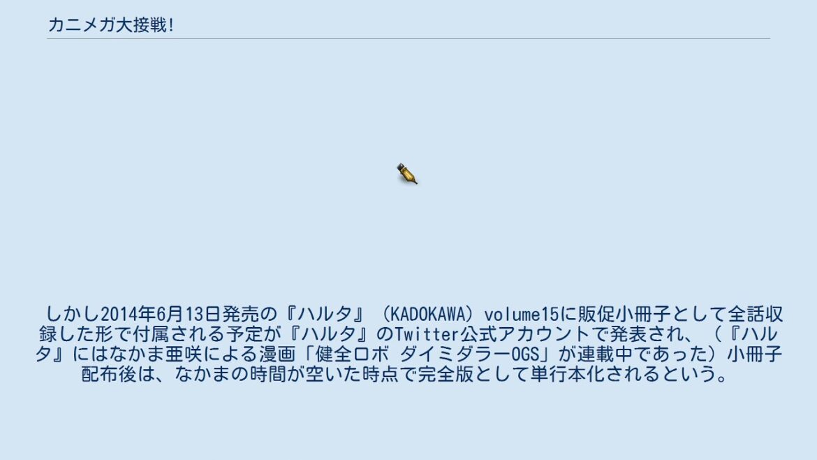 しかし2014年6月13日発売の『ハルタ』(KADOKAWA)volume15に販促小冊子として全話収録した形で付属される予定が『ハルタ』のTwitter公式アカウントで発表され、(『ハルタ』にはなかま亜咲による漫画「健全ロボ ダイミダラーOGS」が連載中であった)小冊子配布後は、なかまの時間が空いた時点で完全版として単行本化されるという。