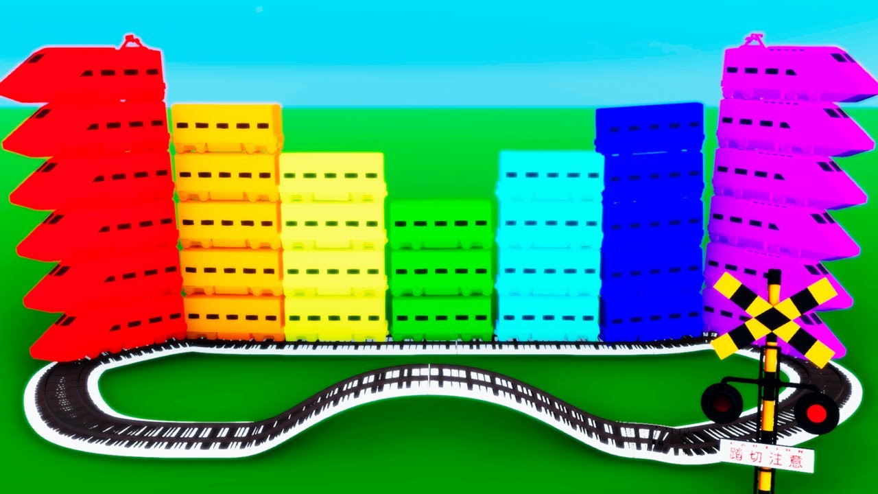 【踏切アニメ】重なって形をつくるカラフルな電車【カンカン】Railroad Crossing Train Animation