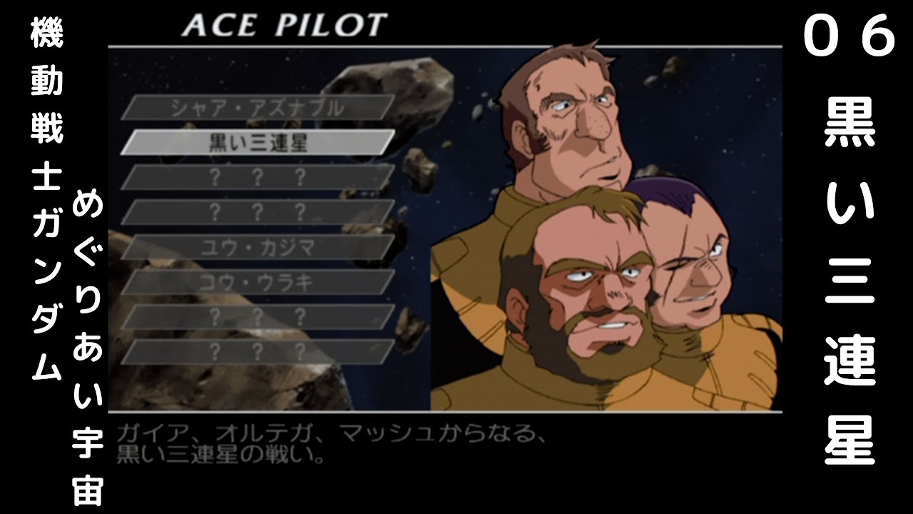 エースパイロットモード:一年戦争、そしてデラーズ紛争を戦った8人のパイロットを主人公としてそれぞれの戦いを追体験するモード。ステージ数はキャラクターごとに異なり、一部のキャラクターはやはりステージの分岐が発生する。