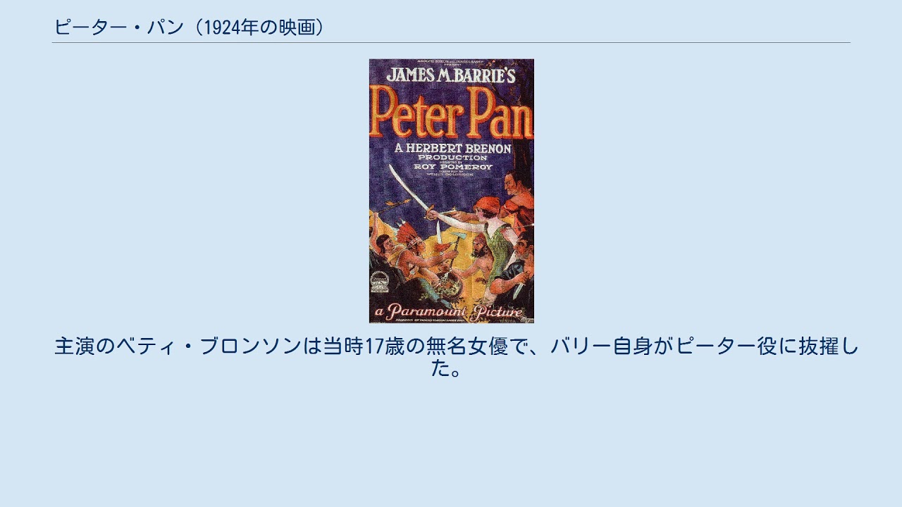 メディアを再生する 『ピーター・パン』本編、字幕なし 『ピーター・パン』(原題:Peter Pan)は、1924年のアメリカ映画。