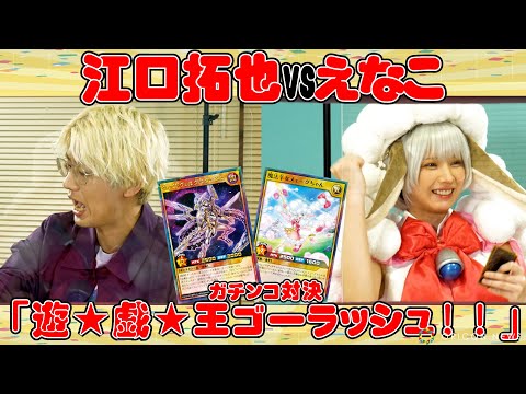 テレビ東京系で放送中にアニメ『遊☆戯☆王ゴーラッシュ!!』に出演している声優・江口拓也(ズウィージョウ役)とコスプレイヤー・えなこ(魔法羊女メェ~グちゃん役)が、ラッシュデュエルをした動画が、ORICON NEWSの公式YouTubeチャンネルにて公開された。実況は『遊☆戯☆王』ファンにはおなじみの声優・南雲大輔が担当し、江口VSえなこのガチデュエルを伝えている。