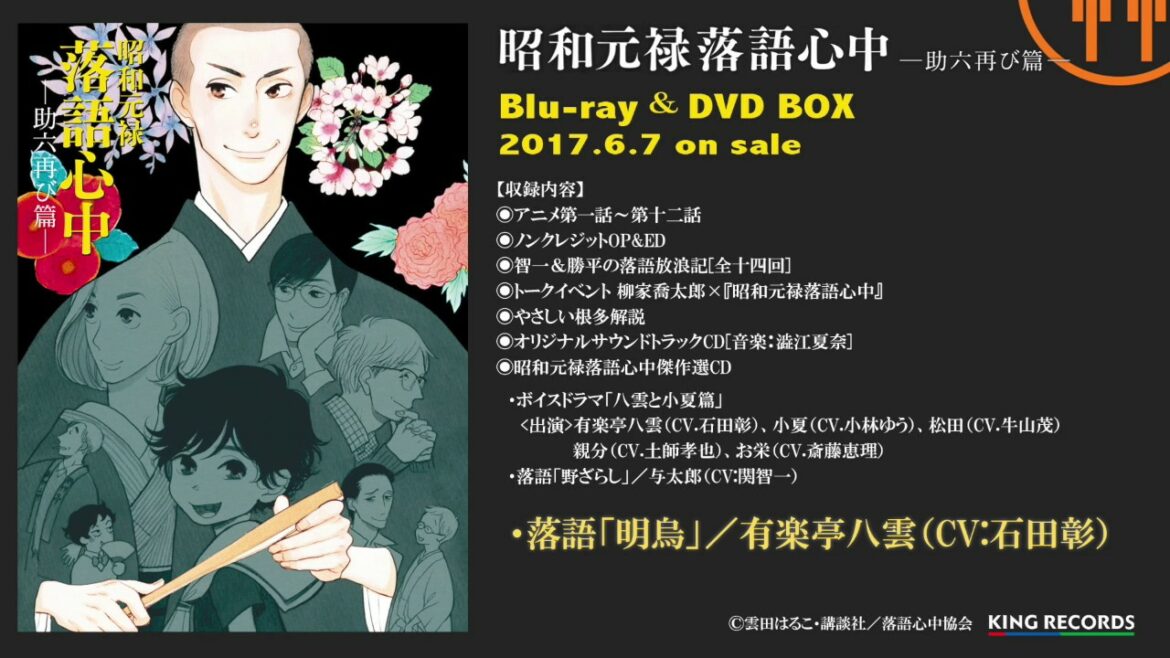 また原作者:雲田はるこ先生による描き下ろしイラストを使用したスペシャルBOX仕様となる他、キャラクターによる落語・ドラマを収録した「昭和元禄落語心中傑作選」CDやサウンドトラックCD付き。