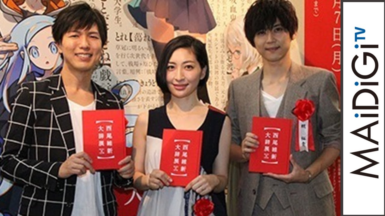 声優の神谷浩史さんと坂本真綾さん、梶裕貴さんが7月27日、松屋銀座(東京都中央区)で行われた小説家・西尾維新さんの展覧会「西尾維新大辞展」(講談社主催)のオープニングイベントに出席。「<物語>シリーズ」などの小説で人気の西尾さん初の展覧会で、展示について神谷さんは「一言で言うと圧倒される。これが一人の作家によって生み出されたものだと思うと怖くなる」と脱帽しつつ、「(見る)時間が足りない。(会場に)軽く1時間以上はいられるんじゃないか」と語っていた。