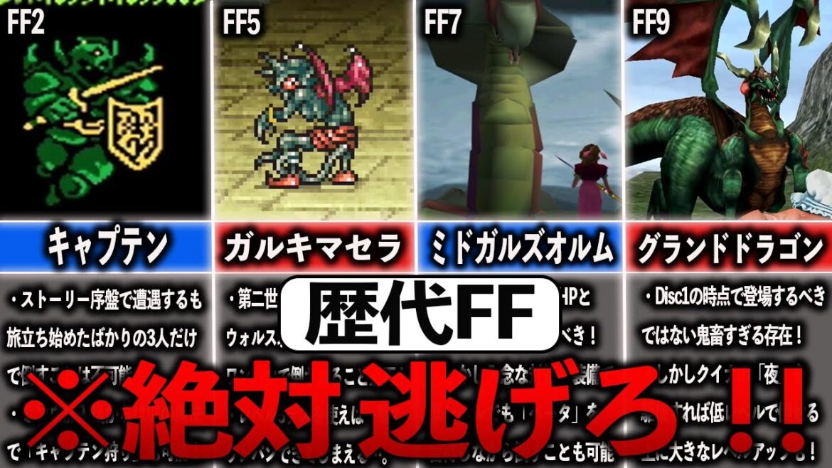 歴代FFの登場タイミングが明らかにおかしい場違いな強敵をまとめてみました。 ゆっくり解説始めました。 ©1991, 2012 SQUARE ENIX CO., LTD.All Rights Reserved. LOGO & IMAGE ILLUSTRATION:©1991, 2012 YOSHITAKA AMANO FCFFFF トラウマモンスターFF 鬼畜モンスターFF10FF2FF5FF7FF8FF9PSPS4RPGSFCSwitchスーファミトラウマトラウマモンスターファイナルファンタジーファイナルファンタジーVIIIファミコンランキング歴代ff選鬼畜モンスター 15 Comments @manko1919tinko 10か月 ago ff7世代はまだビデオが普通に使われてた時代か… @てすと-k3x 10か月 ago FF7の湿地帯はチョコボを使わなくても通り抜けることは一応可能なんよねただ結構ギリギリだし、戻りたいと思ったらチョコボが当然いないから勝てないと最悪一生戻れなくなるから注意は必要負けた時は湿地帯に侵入する前の場所から再開だからな、最悪詰むぜ @暁は水平線 10か月 ago ここにいないモンスターだとFF6の眠れる獅子も入るかな?絡め手使わない正攻法なら最速で戦える時期はかなりの強敵なるけど @kaikai1753 10か月 ago 絶対に勝てないと分かってても初めて見るアダマンタイマイには挑んでみたくなる。 @yuho4964 10か月 ago 12のワイルドザウルス、13のロングイなんかも… @吉田くん-g6y 10か月 ago FF2のキャプテンはわかんねえわな @ストライクカート 10か月 ago FF7のミドガルズオルムは自分の兄貴が裏技使った方法で最初から最強装備のデータにしてたから噛まれた瞬間にクラウドの「超究武神覇斬」やバレットの「カタストロフィ」を攻撃力アップする「興奮剤」を付けた状態でお見舞いして秒殺カウンターしてた(笑) マテリアも普通にバハムート零式とか装備してたから面白くて何度も倒して経験値稼ぎにも利用してたし、噛まれたら大抵1発でリミット溜まるから面白くて😅 @full_bocking 10か月 ago ガルキマセラは場違いというより「この城の地下には恐ろしい魔物が棲みついているぜ」みたいな会話もあるしそういう罠みたいな設定のモンスターやろ @河合俊信 10か月 ago 8のあのマシーンはサイファー狩りの時にケツァクウァトルを育ててダメージ量を増やし応援コマンドで焦らず増やしていけば魔法使わなくても大ダメージ入るからそれで倒してたな。だからこの動画の主が応援を後回しにしてたのにはちょっと驚いたわ。 @ヤマモトユウマ-d9k 10か月 ago ガルキマセラ=最凶の盗難防止装置。 @Nk-ci8rz 9か月 ago 6のミドガルズオルムの性能を知ってるプレイヤーを陥れた7のミドガルズオルムヤバス @Nk-ci8rz 9か月 ago 6のミドガルズオルムの性能を知ってるプレイヤーを陥れた7のミドガルズオルムヤバス @user-ms3qs1wo4s 9か月 ago FF7のミドガルズオルムはステータスが低いうちだとベータ使われたらゲームオーバー。ダメージは1000を超えてくる。だけど古代種の神殿に行けるぐらいになった辺りなら、ベータをラーニングできると思うし、しばらく楽になる @mashir439 9か月 ago X-ATM92って試験前にカード変化からの魔法精製でサンダガを大量に精製できるから、それ利用して対戦時にサンダガ乱発したり魔法剣サンダガ使っていればわりと簡単に勝てたような。ファイガ、ブリザガ、ケアルガもこの時点で簡単に大量精製できるからジャンクションで相当ステータスあげられて強力な攻撃も存外耐えるし、システム理解すれば簡単に倒せると思います。 @hotatekaibashira 9か月 ago 12の最初の砂漠に出てきた恐竜は…? Write A Commentコメントを投稿するにはログインしてください。