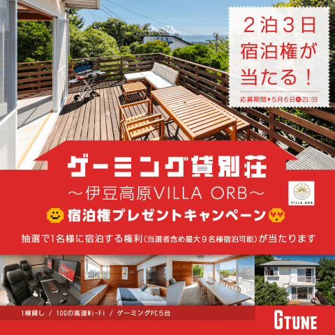 株式会社マウスコンピューターは5月1日、伊豆高原VILLA ORBの宿泊正体キャンペーンを、マウスコンピューターゲーミングの公式Xアカウント(@GTUNE_NEXTGEAR)で開始した。期間は5月6日23時59分まで。