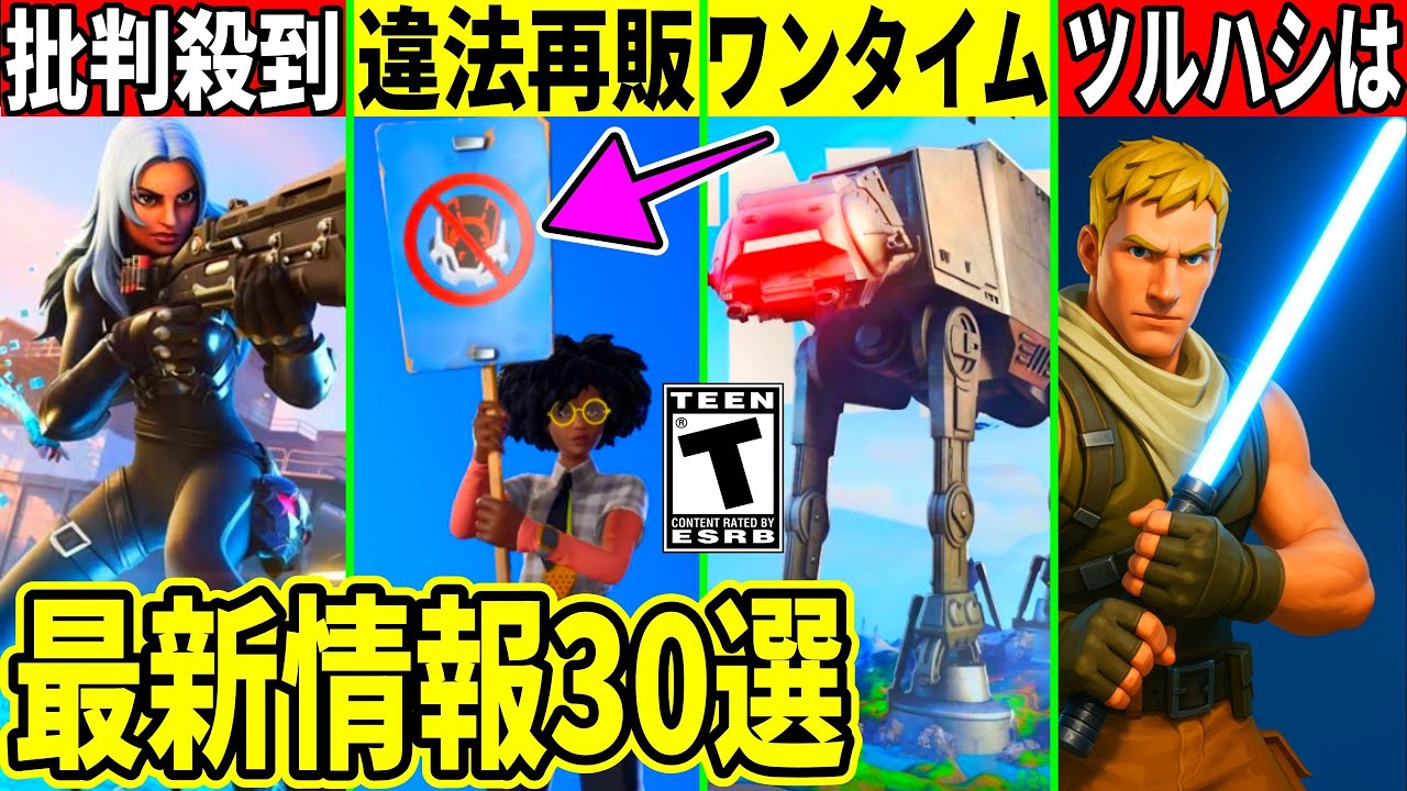 はい、どうも皆さんこんちゃ。4 連休が嬉しい人は高評価。というわけで今回は昨晩上げた爆速リカマための後に判明したことを全てまとめていきます。これさえ見ればこのアプレのことが全て分かるのでこういう動画が嬉しい人は高評価。あ、あと明日は当チャンネルが現在制作しているクリエマップが公開されますぜ。非楽しみに。で、まず今日のアイテムショップが結構い。最初にカエルという新 スキンとセットのテムが新発売。これは ピックの公開していたコンセプトアートの 段階から結構人気のあったスキンです。 個人的にはこのバックアックスも めちゃくちゃいいなと思いました。 さらにビッグダクスという妹とネバプレイ という妹も新発扱いされています。以線 からティザーが来ていたスターウォーズの デカールが新たに付属しているポルシで 911が再販されています。これも結構 かっこいいのでおすすめです。そしてと 同じくスターウォーズのデカールがついて いるドミナスGTが再販されていたり スターウォのブーストやホイールも新発売 。あとはスターウォーズの新しい癖やそれ とは関係ない内キの靴、ついでにジャム トラックも大量に販売されています。 ちなみにスタの靴に関してはエピックから 先行配布をしてもらっているんですが、 その中にウーキーフィートという靴があっ たので、これも近々販売されると思います 。というか今日来るって聞いてたんですが 、それが来てないです。あとはリザート さんのロッカーバンドルが新発売にされて います。競技性に人気のセレナーデが入っ ていて、セットアイテムが多いのでこの スキンを特に変える人もいそうです。最後 にこの画像にある通り75日から121日 ぶりに再販されたアイテムが大量にあるの でショップアイテムを購入する際は忘れず にクレータースポーツSHPOもよろしく お願いします。動画がいっぱい再生されて お金をめっちゃ持ってそうな実況者より常 にお金がない僕を繰りポして助けて ください。家賃と税金が払えません。次は 新シーズンになってからやばすぎるバグが 大量発生したのでまとめていくんですが、 まず面白いこととして前シーズンにあった 結構やばいバグの精霊の無限増殖そして旗 の巨大化なんとこれ修正されていません でした。特に精霊の無限増殖は大会でも 使う人がいるらしいのでかなり致名的なん ですがそれが修正されていなかったわけ です。そして新しく発生したバグとしては 、まずはスイッチ性限定のバグでフレンド リストの一部が消出するバグが発生しまし た。ただこれ本当に消えたわけではなくて 見た目だけの問題で内部でもフレンドが 解除されたりはしていません。で、この バグは現在修正されています。次はリゴ パスを購入するとなんと21個の報酬が 自動でもらえるバグは発生。今は2レベで 1つ報酬がもらえるので約10レベ勝手に 進行したわけです。ま、これはプレイヤー は損してないので悪いバグではありません 。次はリロードに致名的なバグが発生し ました。なんと通常バトルのスター ウォーズ関係の武器がリロードでも出現 するバグが発生しました。他にもストーム が動かなかったり、弾薬箱が開かないバグ 、試合終盤にリブートが無効にならなかっ たり、さらに回復アイテムが全くドロップ しないバグも発生し、もうめちゃくちゃで エピックはリアルタイムにこれの修正に 取りかかっていたんですが、その最中も やばかった。修正方法としてはリロードに スタの武器が出てしまう剣に関してまず チェストやその辺に枠全てのアイテムや 武器を出ないような特貫向上しました。 つまり武器をゲットできないのでツハ フレンジーになります。ただリブートすれ ば武器を持った状態で復活できるので途端 に無双。ま、この辺のバグは全部今は修正 されてると思うんですがなんかすごい パワープレイですよね。それとやっぱりリ ロードってUFNで作っているはずのため こういうアプデのためにバグりがちなわけ です。他にもAXボックス限定でゲーム 全体の画面が暗くなる。バグ発生したり、 これ僕だけかもなんですが、なんか ロッカーで持ち入力ができなくなって アイテムの検索ができなくなりました。次 は最初ジャンプで珍しくエピックが プレイヤーの意見を聞いてとある修正をし ました。それが壁ジャンプとローリング 着地の削除。ま、これは5爆がひどくて 本当に不快で消成という意見が めちゃくちゃ多かったですよね。ただ中に は壁段は消さなくてよかっただろう。いや 、ローリングは残せみたいな逆張りなのか わがまま言ってるキッズが多いんですが、 こんなものはシンプルに両方ゴミなんで、 バトルからはコン一生消してください。ま 、クエのデスランとかで使えたら面白そう なので、今後はそっちでのご活躍を期待し ています。ただエピックはこういう風に新 チャプターの目玉機能を消すのはかなり 珍しいんですよ。これ多分社長の娘がこの 機能で