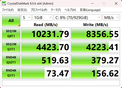 ストレージの速度を測るCrystalDiskMark 8.0.6の結果。PCI Express 5.0 x4接続だけあってリードは10,000MB/s超えと超高速だ水冷BOXの装着は意外なほどお手軽