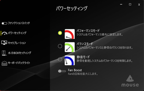 「Mouse Control Center」アプリで動作モードはパフォーマンスに設定した