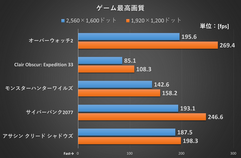 話題のフランス産RPGであるClair Obscur: Expedition 33は、DLSSには対応するがフレーム生成には非対応のゲーム。それでも2,560×1,600ドットで平均85.1fpsを達成。超重量級のゲームでも安心して最高画質でプレイできるパワーを持っている。