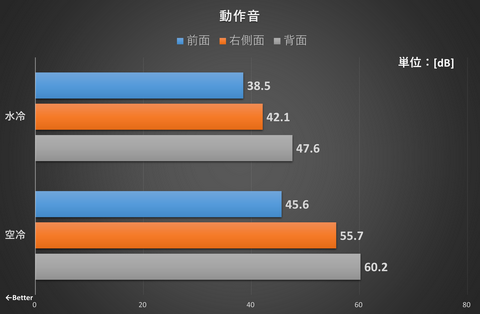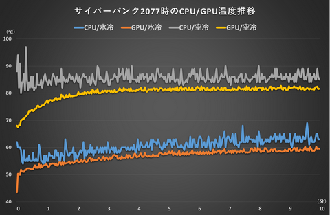 水冷時はCPUが平均60.5℃、GPUが平均56.8℃、空冷時はCPUが平均85.6℃、GPUが平均80.2℃と大きな差になっている。水冷BOXの冷却力の高さがよく分かる結果だ。水冷なら長時間運用の安定感が高まると言ってよいだろう。