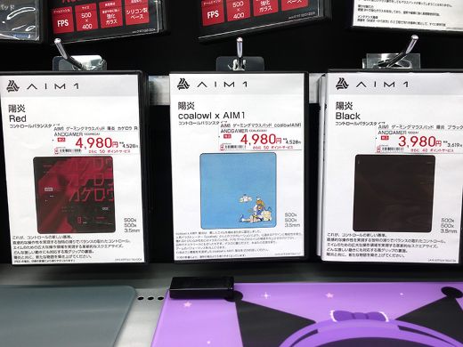 陽炎は、コントロールバランスタイプの滑りを謳う布製ゲーミングマウスパッド。カラーは「ブラック」「RED」で、店頭価格は3,980円。イラストレーターcoalowl氏とのコラボデザインモデルも入荷しており、店頭価格は4,980円。