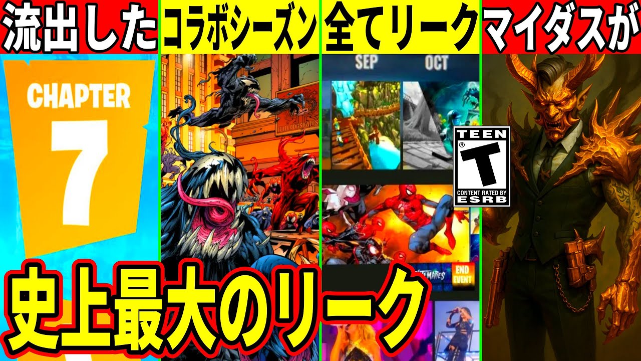 はい、どうも皆さんこんにちは。夏が来 なくていいと思う人は高評価というわけで 今回は今後のシーズンがめちゃくちゃ リークされたり運営がカすみたいな詫を 配って批判殺頭中な件、他にも水にやばい ことが起きていたり、今日の夜の隠し アプリの件、他にも色々なことをまとめて 解説していこうと思います。まず今日の アイテムショップが結構いい感じ。最初に 新スキンのパイナップルビートとセットの アイテムが新発売されています。ちなみに このスキンはパイナップルなのになぜか セットアイテムがス加です。個人的には このラップが夏らしさがあっていいなと 思いました。あとこのスキンはサングラス を外すと目がめちゃくちゃ可愛いです。 さらに今日のショップでは4つの新しい靴 が販売されています。特に注目なのは アニメーション付きのマグマティックスと いう靴。これはキルをするたびに火が強く なっていくみたいです。ちなみに僕はこれ 昨晩先行配布をしてもらってたんですが朝 まで対空マップをしていてバトルを1秒も していないのでまだ使えてません。で、 今日のレアモ枠としては、ファイア スピナーが347日ぶり、ダーのアイテム が337日ぶり、スタークロスが249日 ぶりに再販されています。そんなわけで ショップアイテムを購入する際は忘れずに くれたスポーツ、SHPOもよろしくお 願いします。ガチな話。1%の人しかして くれてないので、あなただけでもクリスポ してくれると助かります。次はかなり やばい話があるのでまとめて解説していく んですが、なんと今後の答えについて とんでもない量のリーク情報が出てきまし た。去年の4月にあったロードマップの 流出。あれは4月から12月までの アップデートかコラボシーズンのテーマが 全れしたんですけど、それと同じくらい やばいか。もっとやばいです。ま、皆さん 僕のことはリーク情報が大好きだと思っ てると思うんですが、これ以前話した通り 実はそんなに好きじゃないんですよ。その ためロードマップのリークも個人的には 冷えました。ただかつてのフォトナの偉人 は普段からリークを見てるやつはロード マップのリークもちゃんと見ろと夜は歯を 磨いてちゃんと寝ろとも言っていたので僕 はロードマップのリークもちゃんと見て歯 は2週間磨いてないんですが今回の流出は その偉人もびっくり普段からリークを見 てるやつもいやさすがにこれは見なくて いいんじゃないかというレベルかもしれ ません。あと泡吹いて死にます。そんな わけで今回は僕もちょっと冷えてるんです よ。やっぱり今後の生存がこんなに早く出 てしまうと、当チャンネルは考察要素も あるので、それができなくなってしまうの はちょっと損失なんですよ。ま、出て しまったからには動画にしようと思うん ですが、皆さん1つ安心してください。 このリークは全部が本当ではありません。 ちょっと突票症ないものとか明らかに 追いつ間が合わない部分とか、あとは本物 のリークだったとしてもエピックは今後 色々変更すると思うので実際どうなるかは 分かりません。そのため話半分で聞いて ください。ただ今回の情報の出所は エピックの内部関係者です。しかも1人 じゃなくて複数人から出てきてます。 さらにさらにその関係者はエピックを首に なった人が腹いでリークをしてるらしい です。これは審議は定かではないんですが 、出所から考えたら信憑性はかなり高そう ですよね。そのわけで話していくんですが 、まず現在のシーズンはチャプター6ミニ シーズン1ということで、次がシーズン3 になります。で、そのテーマとチャンネル が誰よりも早く、リークされるよりも早く 考察していたスーパーヒーローシーズンで あることがほぼ確定しました。これについ てはかなり詳しくリークされていて、まず スーパーヒーローアカデミーが登場します 。ま、ヒアとかマーベルとかヒーローが 登場する作品には必ずこういうヒーローを 要請する学校がありますよね。で、その アカデミーを作ったのはマイダスらしい です。マイダスが資金提供をしています。 そのためマイスが学園長になっているかも しれませんと考えるとエージェンシー みたいなでかい建物になってそうですよね 。さらに以前から話していた新しい スーパーマンコラボではスーパーマンに 変信できるミシックが来そうと話していた んですがこれガチで来ます。しかもゴジラ とかドームみたいな試合中に1人だけ変信 できるみたいです。他にもスーパーマンに 登場する孤独の要塞というロケーションも 登場します。これはマスクドメドが変化 するみたいです。さらにDCからは バットマンの相方ロビンが登場します。 これはバトルパスになるみたいです。その ため次シーズンはDCコラボも多そうです よね。他もスーパーヒーローの悪役は毎で 登場した鬼大子になっています。で、なん とこれもバトルバススキンになるみたい です。さらに悪役としてコルというスキ