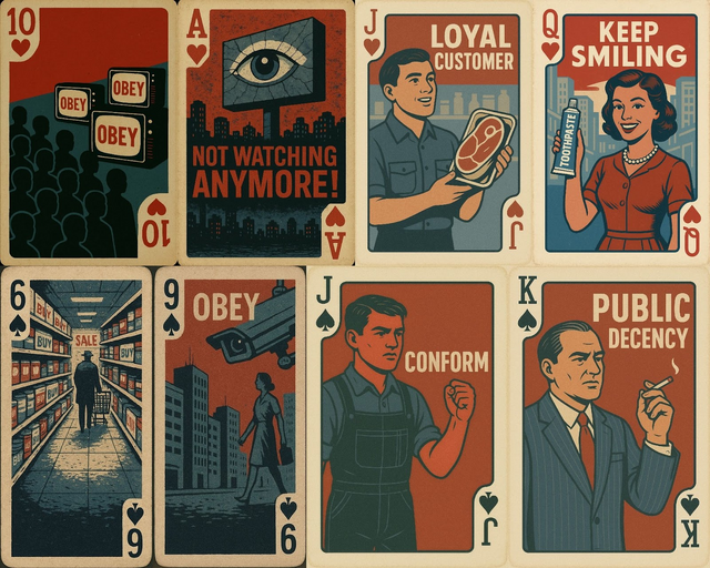 小説『1984』と、カードゲーム『Mao』にインスパイアされたディストピアな心理カードゲーム。基本的なプレイングカードの52枚セットを使い、基本的にはUNOのように一定のルールでカードを出し、先に手札がなくなったプレーヤーの勝利。
