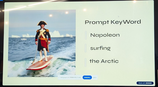 画像生成AIを使ったクイズゲーム。プレーヤーにはプロンプトを伏せたまま、『ナポレオン』『サーフィン』『南極』といった奇想天外な組み合わせで画像を生成し、どんなキーワードから出てきた画像なのか?を当てるパーティーゲーム