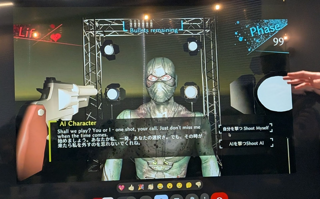 ただしAIはどの弾倉に実弾が入っているか知っており、台詞でプレーヤーを騙しブラフをかけてくる仕組み。うまくプレーヤーに悟らせず、誘導する台詞をLLMで生成。