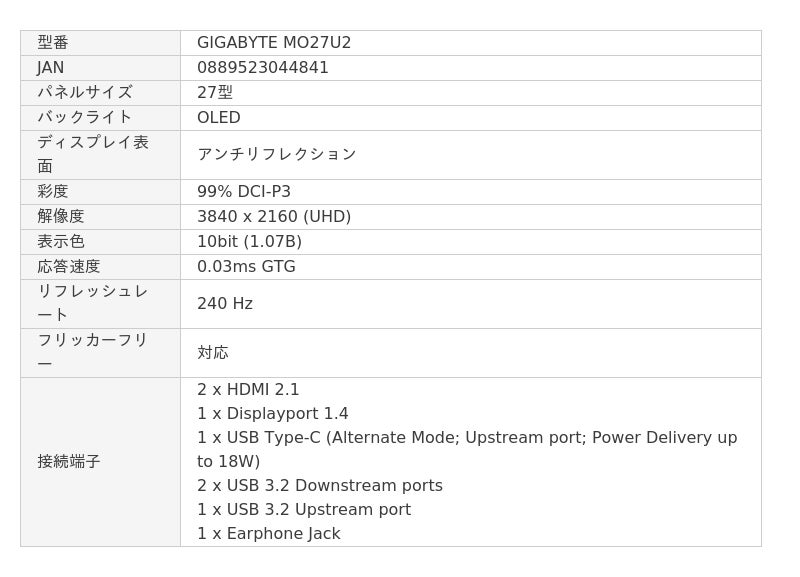 『GIGABYTE MO27U2』は、UHD解像度(3840×2160)の27インチ有機ELゲーミングモニターです。