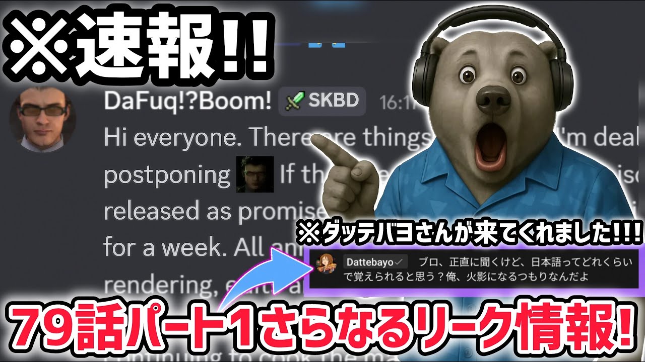どうもゾゲームズのザランです。という ことで今回はですね、スキトレ79話は パート1度最新情報をお伝えしていきたい と思います。はい、ということで皆様 おはようございます。2025年6月1日 どうも緊急者中系YouTuber あタゲームズのザでございます。さあ、と いうところで79話なんですけども、ま、 最初にですね、結論をちょっとお伝えさせ ていただくと、今日ですね、79話パート 1。ま、本当であればちょっと公開される 予定だったんですけども、ま、残念ながら というかですね、ま、ちょっとね、 ダファックブさんの所持場によって、え、 1週間ほどですね、え、ちょっと エピソードがですね、ちょっと遅れると いうことになりました。ま、ちょっとです ね、その辺のね、え、解説等々やっていき たいと思いますので、是非ね、動画最後 まで楽しんでってください。というところ で、ま、実はザタさんもですね、今日あの 2時ぐらいからですね、もう4時間ぐらい 生放送やっていたんですけども、まあです ね、ちょっと本当に最近ザタさんの生放送 ですね、ザタ生ですね、いろんなことが 起きておりまして、ま、ちょっと本当にね 、著名なね、海外有名スキビトレ系 YouTuberさんがね、たくさんね、 いらっしゃっているというところで、 ちょっとゾ田さんもうついちゃってしまっ てるんですけども、え、ちょっと、ま、 その辺もお伝えできればなと思います。と いうところで、まずですね、こちらですね 。はい。まずですね、今日の最新情報と いうところなんですけど、イオさんですね 。リオさん、本当にいつもありがとう ございます。いつもね、そう、今日もね、 配信の方にもね、遊びに来てくださいまし て。で、さらにですね、ま、ちょっと余談 なんですけど、イオさんですね、なんと今 うちのチャンネルのメンバーさんにもなっ ていただいてるんですよね。ま、これはね 、え、当チャンネルの視聴者様が メンバーシップギフトの方をですね、え、 購入していただきまして、イオさんがです ね、当選されたっていうところなんです けども、もうどういうことっていうこと ですよね。ひさんがうちのチャンネルの メンバーってもうちょっともうなんかね、 もうすごいことすぎてよくわからないん ですけどもね、もう本当にありがとう ございますね。で、そしてなんですけども 、ま、こちらですね、ま、本日ですね、イ さんもですね、もうあの、2時ぐらいから もずっとね、やっていたわけなんですけど も、ま、ダ白ブームさんとね、最新情報は ありますか?というところでね、あの、ま 、あの、Discordの方で、え、です ね、連絡をね、取られていたんですけども 、こちらですね、え、ダファックブーム さんからついにですね、え、日本時間で 言うとちょうど6時前ぐらいなのかな、え 、に、え、ですね、え、ダフブームさん からやって、えっと、ですね、メッセージ の方が到着されたというところなんです けども、こちら翻訳したものがこちらです ね。え、デファックブさんですね。皆さん こんにちは。と現在の世界で生活でどうし ても延期できない、え、事情に直面して おり、それが影響しておりますと。え、 もしその問題がなければエピソード79 パート1はですね、ま、今日ですね、え、 ま、本当ならば今日、ま、あの、日本時間 では6月1日なんですけど、海外ではです ね、まだ5月31日というところで、ま、 今日本当はね、公開される予定発だったん ですけども、ま、ほんの少し約1週間ほど の遅れが、え、必要になってしまいました と。で、なんですけども、ま、全てのね、 アニメーション作業はすでに完了しており 、あとは最終的なレンダリングや編集、 あと音ですね、音響デザインを残すのみ ですと。本当はこれ以上リーク情報は出し たくなかったのですが、延期となったため 、え、代わりに継職を1つご用意しました とね、え、リークがですね、1つ出るん ですよ。メインデッシャの完成に向け、え 、引き続き調示中ですので、またお会いし ましょう。というところでね、ま、1週間 のですね、え、ま、あの、ちょっと遅れと なったんですけども、まあ、もう全然です ね。え、すいません。がちょっと1発取り でやってるんですけども、もうね、喉が あれなんですけども、1週間はもう 全然オッケーですよね。もう全然オッケー でございます。はい、というところで、え 、リークというところなんですけども、え 、まずこちらですね、ババント。はい。 こちらですね。もう意味心なね、いろんな ね、ところちょっと気になるところなん ですけど、ま、ちょっとね、1個ずつ、ま 、気になっ気になってるポイトっていう ところね、お話しさせていただくんです けど、まずこちらですね。カメおそらく これカメラ軍基地のね、内部だと思われる んですけども、え、これね、ラ、あの、 あれラージテレビマンがいるんですよね。 そう、つまりこれ何が言いたいかって言う と、おそらく