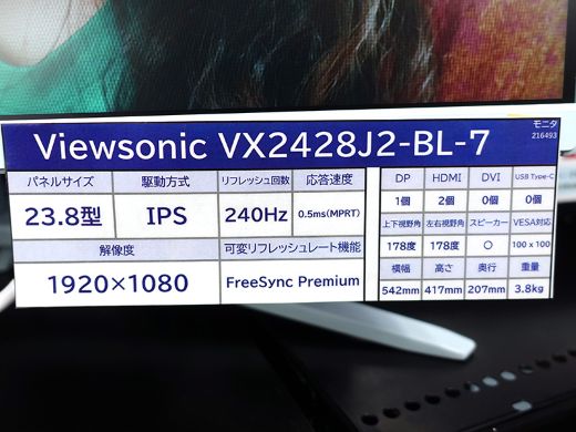 240Hz駆動の液晶パネルを搭載したViewSonicの23.8インチゲーミングモニター「VX2428J2-BL-7」が登場。