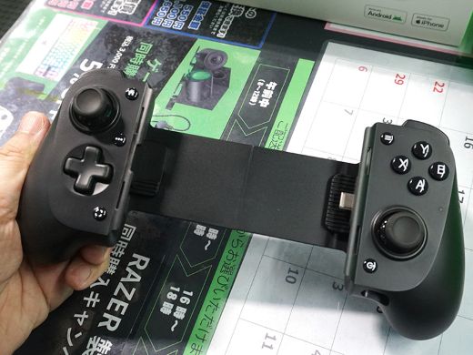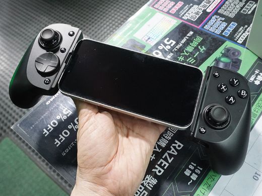 Kishi V3は、iPhone 15シリーズ以降やAndroidデバイスで使えるUSB Type-C接続のゲームパッド。中央にスマートフォンを挟み込んで使う製品で、装着時は携帯ゲーム機のように一体化したスタイルになる。