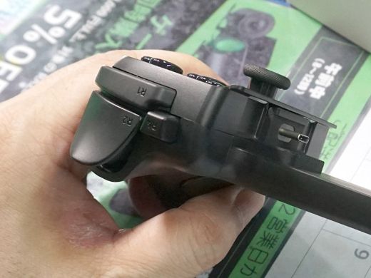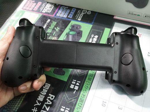 トリガーボタンに加えて背面にマウスクリックボタン×2を備えるほか、3.5mm音声出力やパススルー充電可能なUSB Type-Cポートも搭載。有線USB Type-C接続でPC用ゲームパッドとしても使用できる。
