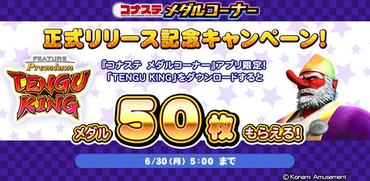 また、「フィーチャープレミアム TENGU KING」をアプリ内ダウンロードコンテンツとして『コナステ メダルコーナー』に追加したことを記念したキャンペーンも実施しています。期間中に『コナステ メダルコーナー』アプリ内にある「フィーチャープレミアム TENGU KING」をダウンロードした方全員に、アプリ内で使えるメダル50枚をプレゼントします。