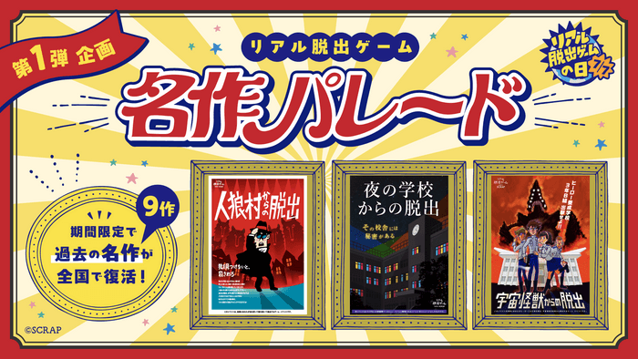 全世界で累計1,490万人以上を動員しているリアル脱出ゲームを企画制作する株式会社SCRAP(本社:東京都渋谷区、代表:加藤隆生)は、7月7日の「リアル脱出ゲームの日」を記念したさまざまな企画を実施します。第3弾企画として、「名作オンラインゲーム ワンコインセール」、第4弾企画として、「名作謎付きクリアファイル 復刻販売」を実施いたします。