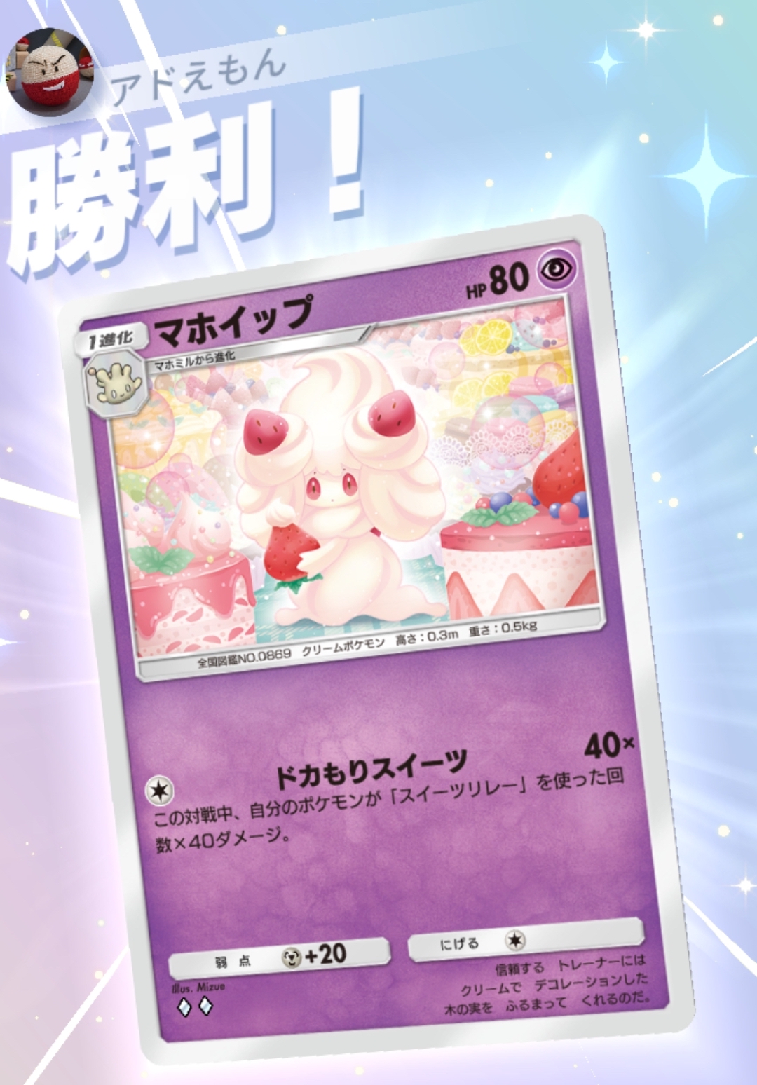 このデッキの使い方は至ってシンプル。序盤中盤は「スイーツリレー」を連打して速攻を仕掛け、相手の育成されたエースポケモンが出てきたら「マホイップ」の「ドカもりスイーツ」をぶつけてワンパンを狙うのがメインプランとなる。