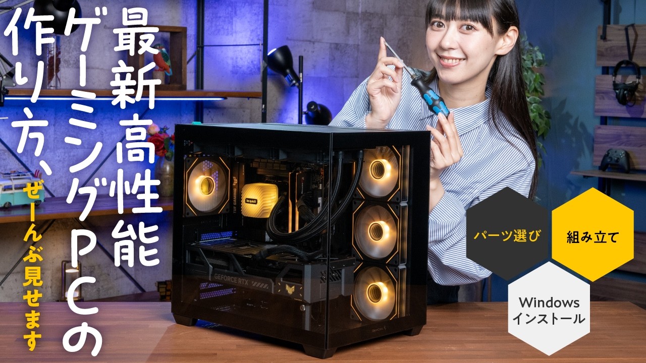 好きなパーツを組み合わせて作る自作PC はゲームや動画編集ライブ配信といった 用途そして予算に合わせて自分だけの1台 を作ることができるのが魅力ですさらに PCのルックスも自分の好みに仕上げる ことができますYouTuberや実況者 が使ってるようなクールな1台を手に 入れることができるっていいですよねでも 組み立てが難しそうで手が出しにくいと 感じている方も多いのではないでしょうか そこで今回は私セリ沢が自作PCの 組み立て手順を詳しくレクスチャーして いきます 今回制作するマシンを紹介します コンセプトは高性能で長く使えてクールな ルックスのゲーミングPCトリプルA タイトルを4K改造で楽しんだりe スポーツを240Hzといったハイ リフレッシュレートで快適にプレイでき ます動画編集やゲームの実況配信も余裕 ですルックスにもこだわっています各種の 発行パーツとサイドとフロントがクリアに なったピラーレスタイプのPCケースを 組み合わせて組み込んだPCパーツが かっこよく見えるように演出ゲーム プレイ時のテンションも爆上がりです部屋 のインテリアにもなりますこのマシンを 構成してるパーツを紹介していきましょう CPUはPCが行う計算処理の大部分を 担当する最も重要なパーツです今回は Intelの最新ハイエンドモデル ウルトラ9プロセッサー285系を選び ましたゲームも動画編集も得意ですが従来 のモデルよりも小電力性に優れており 低消費電力かつ静かに運用することが できるようになっています各パーツを接続 するベースの基盤がマザーボードです今回 はハイエンドCPUを交付化で長時間仮想 させても安心の強力な電源回路と ミリタリーグレードの高耐久部品を採用し ながらコスパにも優れるASUSTA ゲーミングZ90+Wi-Fiを使います インターフェイスもサンダーボルト4や 2.5GRを始めとして豊富に搭載して いるので今後登場するものを含めて周辺 機器を多数接続することが可能です グラフィックス処理を担当するビデオ カードはゲーム性能に大きく影響します 今回はNVDAの最新GPUの上位モデル GeForceRTX5080を搭載した ASUSTFゲーミングGeForce RTX508016GBGDR7OC エディションを選択超強力なGPUを超 強力なクアでばっちり冷やしてゲームで 高いパフォーマンスを長時間維持します メモリはDDR55200の24GBを2 枚搭載合計48GBですGSスキン のリップJM5RGBというライティング 対応モデルを選んでいますWindows や各種のアプリケーションユーザーの データを保存するSSDはクルーシャルT 501TB性能と容量価格のバランスが 良いPCIExppress4.0対応 モデルの中で最速クラスの狙い目モデル ですゲームの呼びなしは非常に高速に行い ます個性能なCPUを安定して動作させる ためには強力なCPUクーラーが必要です 今回は冷却だけではなく正音性にも優れる ビークワイエットの簡易水冷タイプライト ループ360mmを選びましたLEDに よるライティングにも対応してるんですが 派手になりすぎず上品に光るのも魅力です 各パーツに電力を供給する電源ユニットは BQのPUAPower12M850W 電力効率に優れた80+ゴールド認証を 取得した850W電源ですBQRの製品 らしく動産は静かなのも特徴ですATX 3.1とPCIExpress5.1と いう2つの最新企画に対応してるので今後 登場する新パーツにも対応できます 全てのパーツを組み込むPCケースはPC のデザインを決めるだけでなく冷却性能に も影響する重要なパーツです今回選んだ ディープクールのCG5304Fは有効の ピラーレスタイプでこだわりのパーツが しっかり見えるだけでなくRGBファンを 4期も搭載ファンを追加購入することなく リーッチなライティングが楽しめますこれ だけファンがあれば冷却性能にも期待でき ます最後に忘れてはいけないのがOSです これがないとPCは動きません今回は Windows11Proを選びました パーツセットで購入できるお買なDSP版 を選んでいます 今回のパーツ構成で必要な道具はナンバー 2のプラスドライバー1つだけです ドライバー選びのポイントは先端が磁石に なってるものある程度長さがあるものが 組み立てに使いやすいです 組み立ての前にはドアノブなどの金属に 触って静電器を逃しておきましょう 組み立て作業する時は動きやすい服装にし ておきましょうPCを自作するなら性能 だけではなくライティングを生かした かっこいいルックスにしたいという方も 多いのではないでしょうかここにもパーツ 選びの注意点があります実は単純に派手に 光るパーツを集めるだけだと思ったほど かっこよくならないことがよくあるんです マシンのデザインについては自由に楽しむ のが1番ですがどうやったらかっこよく なるのという声もよく聞かれますここでは ライティングを生かしたマシンをかっこ よく仕上げるためのパーツエラビド ノーハウを解説しましょうポイント1各 パーツの色を統一するPCケースマザー ボードCPUクーラーメモリなど各パーツ の色を白や黒で統一するとデザイン的な 統一感が生まれます ポイント2LEDの発酵色は統一しよう各 パーツの発酵色を揃えるとここでも統一感 が生