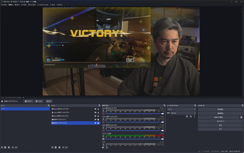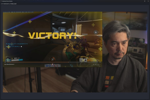 その画像をOBSで表示させるのだが、”配信と同じレイアウトで表示”させておく必要がある。ゲームが全画面表示(カメラ映像はゲーム画面上に重ねている)なら特に意識しなくていいが、下記の画像などのようにレイアウトで縮小させている場合は、そのゲーム画面に合わせて勝利画面の画像を表示させておく。