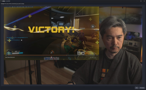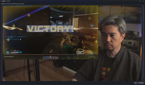 先ほどの参照画像の保存の時と似たウィンドウが表示されるが、こちらはライブの映像となる。ここでも、先ほどと同様にVICTORYの部分を範囲指定するのだが、今度は先ほどより少し広い範囲を選択するという点に留意しよう。具体的にはVICTORYの上下左右に数mm程度の余白ができるくらいだ。ここで選択した範囲が、1つ前の手順で選んだ範囲より狭いとパターンマッチングができないためだ。このウィンドウには「OK」ボタンはないので、そのまま閉じる。