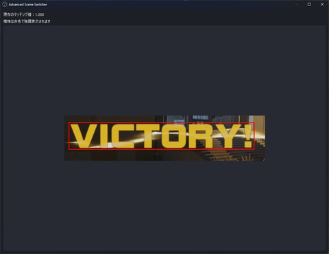 基本的にはこれでマクロ条件は設定完了なのだが、パターンマッチングがうまく機能しないこともある。これは、ASSでやっているのが文字認識ではなく、文字の周囲も含めた画像認識だからだ。今回例として使っているOverwatch 2の場合だと、実際のゲーム画面ではVICTORYの文字の背景はマップごとに変わるし、VICTORYの文字自体にもアニメーションで装飾が入ったり、少しずつ大きくなるというように変化が生じる。そのため、判定基準として使う参照画像と実際のゲーム画面とが100%一致することは少ないのだ。
