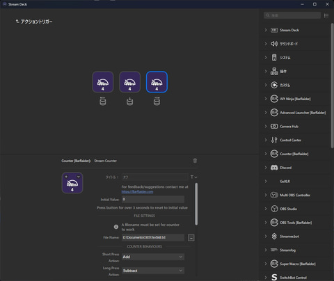 また、Stream Deckの「Stream Count」というプラグインを使って、Stream Deckのボタンを押すとカウントを増やし、長押しするとカウントが減り、さらに長押しすると0にリセットできるようにしてある。ASSの扱いに慣れたら、自分が運用しやすいカウンタの処理方法を考えてみるといいだろう。