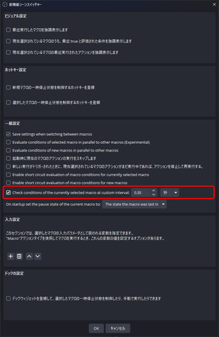 もう1つの調整箇所として、マクロの名前の行の右端にある歯車アイコンを押して、「Check conditions of the currently selected macro at custom interval」にチェックを入れて、パターンマッチングを行なう間隔を指定するのもアリだ。