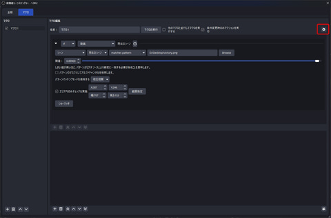 これで、「現在のシーンの指定範囲にVICTORYの文字が表示されたのを認識したら」というマクロ条件を作成できた。後は、その下の「マクロアクション」のエリアで「+」を押して、OBSで実行する一連の動作を作成していく。ここでは、勝利するたびに、画面に表示した勝利数のカウンタを増やすルーチンを紹介する。