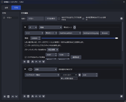 これで、マクロが実行(勝利判定など)されるたびに、「victory_count」という変数が1ずつ増えていく。また、OBSを再起動するたびにカウンタは「0」にリセットされる。