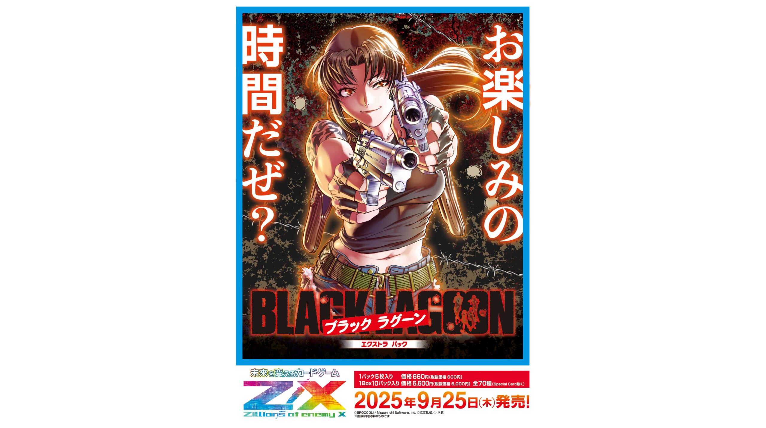 株式会社ブロッコリー(本社:東京都練馬区 社長:鈴木 恵喜)は、トレーディングカードゲーム「Z/X(ゼクス)- Zillions of enemy X -」と大人気コミックス「BLACK LAGOON」とのコラボパックが2025年9月25日(木)に発売となることを発表しました。