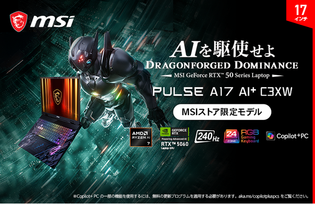 この度、エムエスアイコンピュータージャパン株式会社は、AI処理性能が最大50TOPSのNPUを内蔵したCPU「AMD Ryzen(TM) AI 7 350」と従来製品よりもAI処理性能が向上した「NVIDIA(R) GeForce RTX(TM) 5060 Laptop GPU」を搭載し、Copilot+ PCに対応したeスポーツゲーマー向けハイスペックAIゲーミングノートPCとして誕生した「Pulse A17 AI+ C3XW」シリーズより、「Pulse-A17-AI+C3HWFKG-2051JP」をMSI公式オンラインショップ(以下、MSIストア)にて本日、2025年7月10日(木)より順次発売いたします。