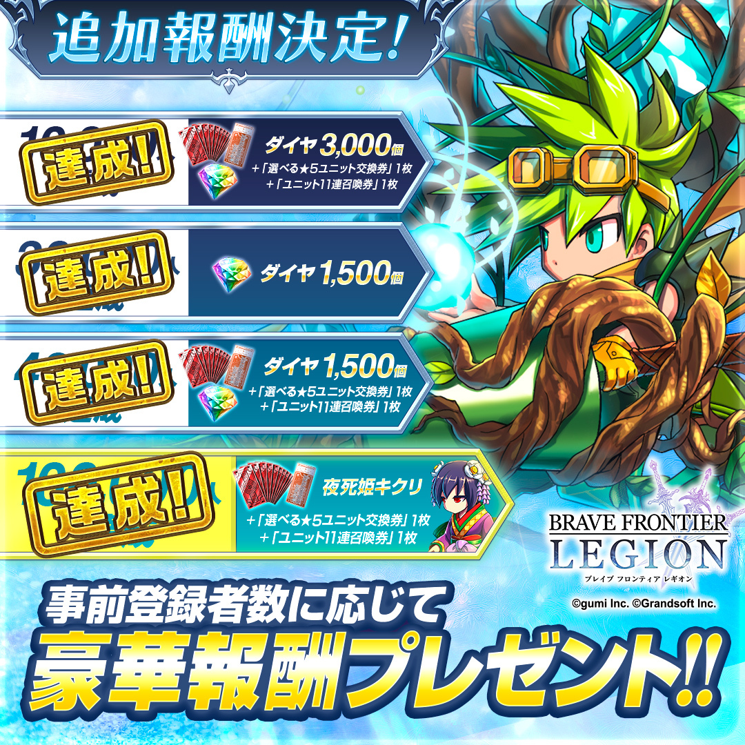 『BRAVE FRONTIER LEGION』は、「召喚師」として異界に眠る英雄や神々の魂を呼び覚まし、無数のユニットを従え最強のレギオンを結成し、壮大なバトルに身を投じる共闘対戦RPGです。の達成報酬をご用意していますので、ぜひご期待ください。