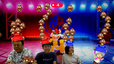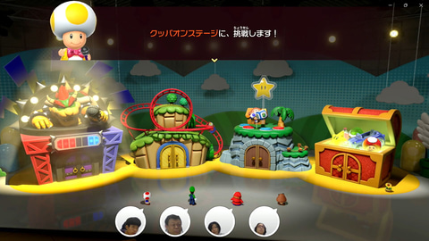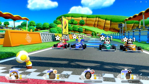 USBカメラを接続していると、プレイヤー全員の顔が常に表示されるのも楽しい。例えば、ミニゲームの結果発表で負けたチームのキャラクターは転ぶようになっているのだが、顔の表示もキャラクターにあわせて傾くようになっているなど、芸の細かさはさすがだ。今回は、オフラインでしかプレイしていないが、オンラインでも同様に、フレンドの顔を見ながらプレイできる。ボイスチャットと組み合わせることで、離れた友人とのプレイがとても盛り上がりそうだ。