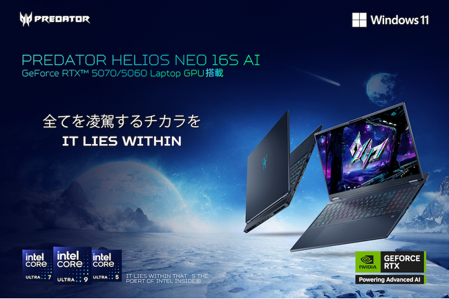 日本エイサー株式会社(本社:東京都新宿区、代表取締役社長:ボブ・セン)は、コアなゲーマーに向けた最上位ゲーミングブランドPredator (プレデター) より、2025 年モデルのゲーミングノートPC「Predator Helios Neo 16S AI」の新製品として、GeForce RTX 5070/5060 Laptop GPUを搭載した2機種を、本日7月31日よりAmazonおよびAcer公式オンラインストアにて順次発売いたします。