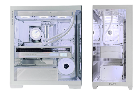 C500 / GIGABYTE STEALTH モデルは、GIGABYTEの背面コネクタに対応するパーツ「STEALTH」シリーズを採用しており、ガラスパネル越しのケーブル露出を極限まで抑えながら、スムーズなエアフローで冷却と性能を最大限に引き出したとする製品。さらに、GIGABYTEのAORUSブランドのパーツが多数使用されており、PC本体はホワイトで統一されている。